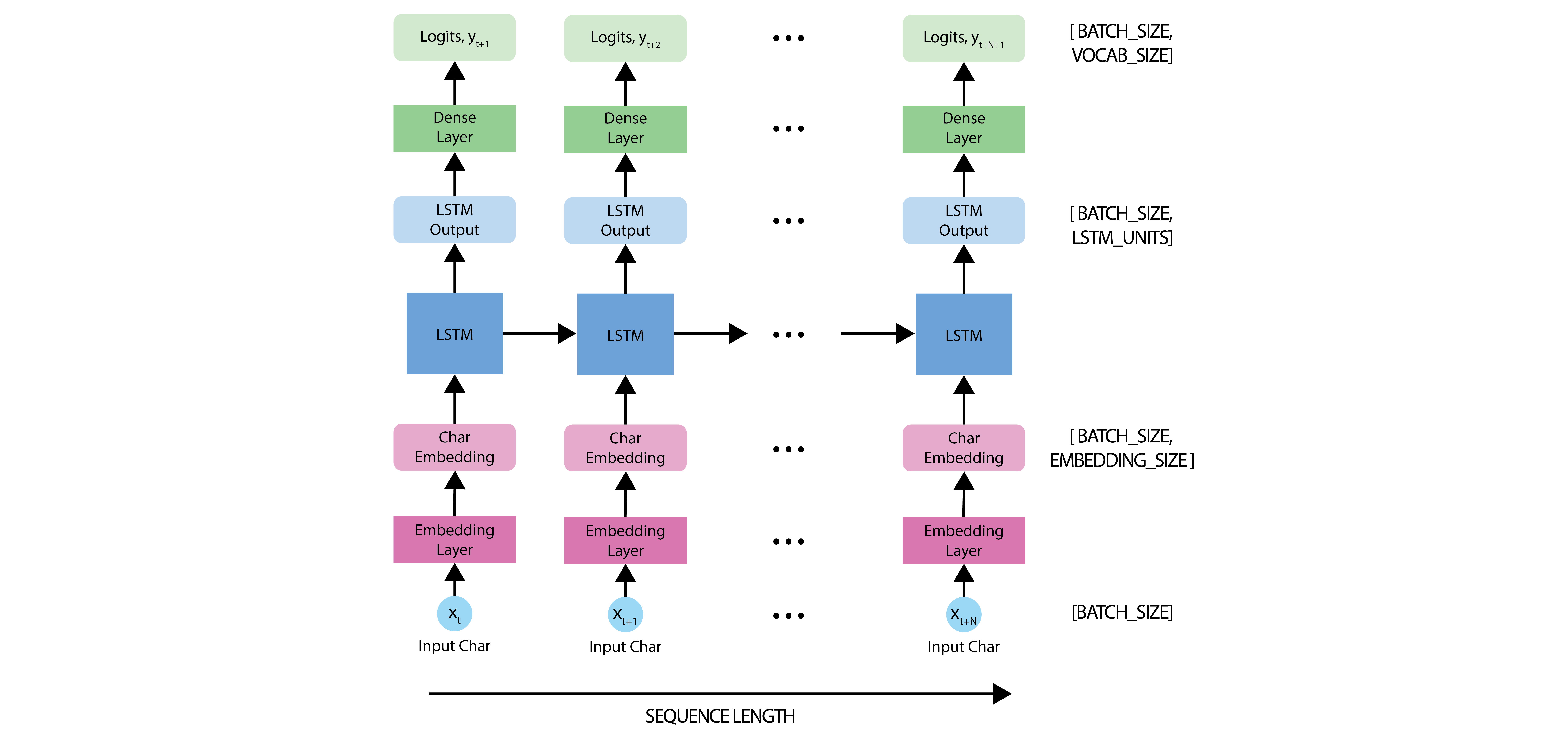 nn.Embedding: This is the input layer, consisting of a trainable lookup table that maps the numbers of each character to a vector withembedding_dimdimensions.nn.LSTM: Our LSTM network, with sizehidden_size.nn.Linear: The output layer, withvocab_sizeoutputs.